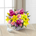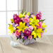 The FTD® Bright Lights™ Bouquet brings color and beauty straight to your special recipient's door! Yellow Asiatic lilies, pink roses, purple stock, lavender monte casino asters, pink carnations, pink mini carnations and lush greens are brought together to create a sweetly fascinating flower arrangement. Presented in a square lavender pastel washed basket, this fresh flower bouquet is set to make an excellent birthday, thank you or get well gift.