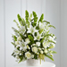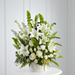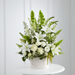 The FTD® In Our Thoughts™ Arrangement is a symbol of pure peace and caring kindness. White roses, tulips, freesia, Oriental lilies, double lisianthus, monte casino asters, and snapdragons, are beautifully offset by bright green Bells of Ireland, ivy vines, and an assortment of lush greens to create an elegant display that conveys your deepest sympathies for their loss. Arrives in a large round whitewash basket.