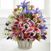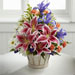 The FTD® Wondrous Nature™ Bouquet is bountifully bedecked with a dazzling display of color and beauty. Stargazer lilies stretch their fuchsia petals out amongst an arrangement of blue iris, white traditional daisies, orange mini carnations, purple statice, and yellow solidago in a round whitewash handled basket, creating a delightful bouquet your special recipient will adore.